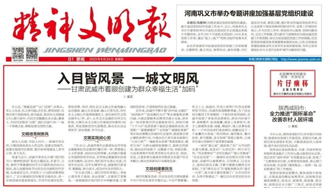 8月24日《精神文明报》刊登“入目皆风景 一城文明风——甘肃武威市着眼创建为群众幸福生活‘加码’”