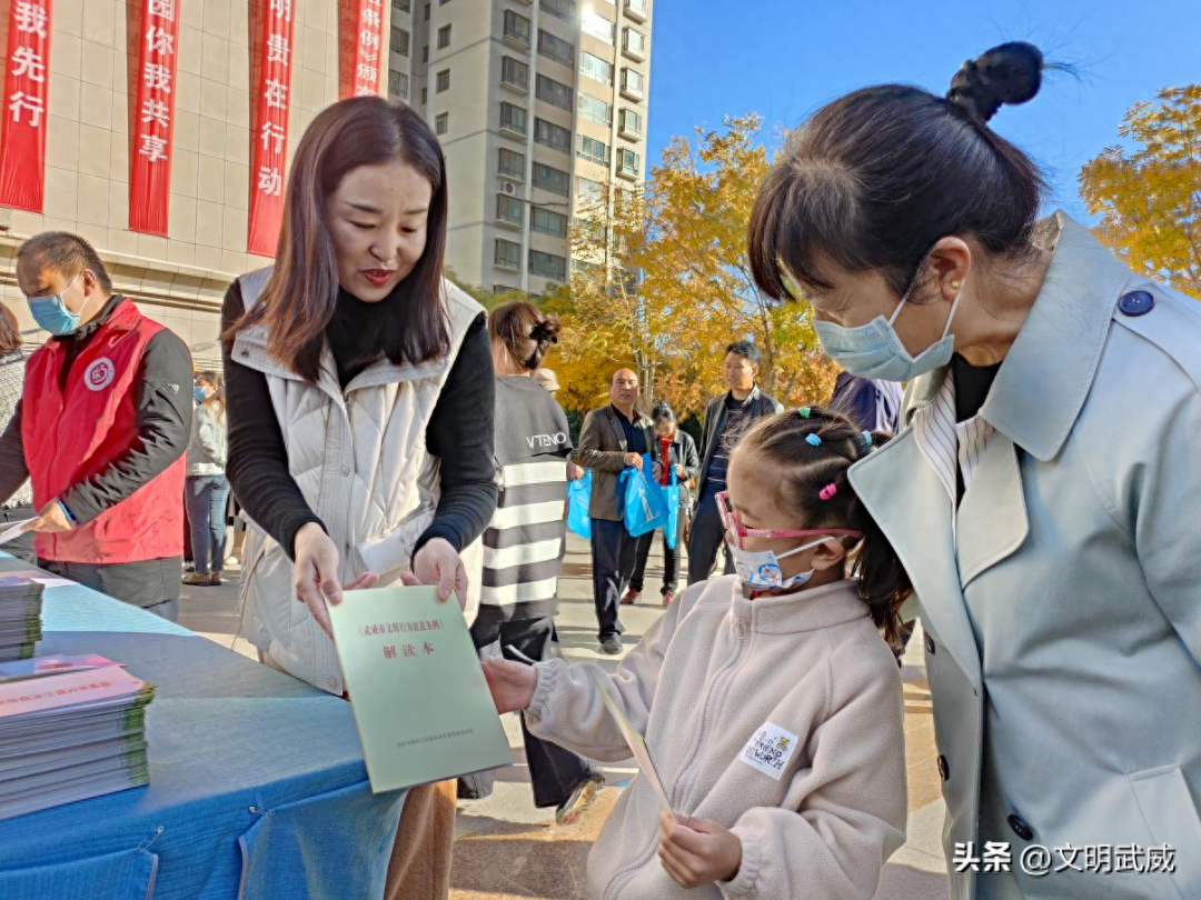 11月1日上午,《武威市文明行为促进条例》(简称《条例》)颁布实施一周年“学文明条例 做文明市民”主题宣传活动在凉州区宣武街宋家园社区广场举行。市委常委、市委宣传部部长陆世平同志出席活动并致辞,凉州区委分管领导就贯彻落实《条例》情况进行了发言,市文明办向市直相关部门、凉州区各街道赠送了《条例》解读本和宣传彩页,组织市民开展了有奖知识问答。通过开展丰富多彩、喜闻乐见的活动,在寓教于乐中宣传解读了《条例》出台的目的和意义,以及市民应当遵守的基本行为规范等。