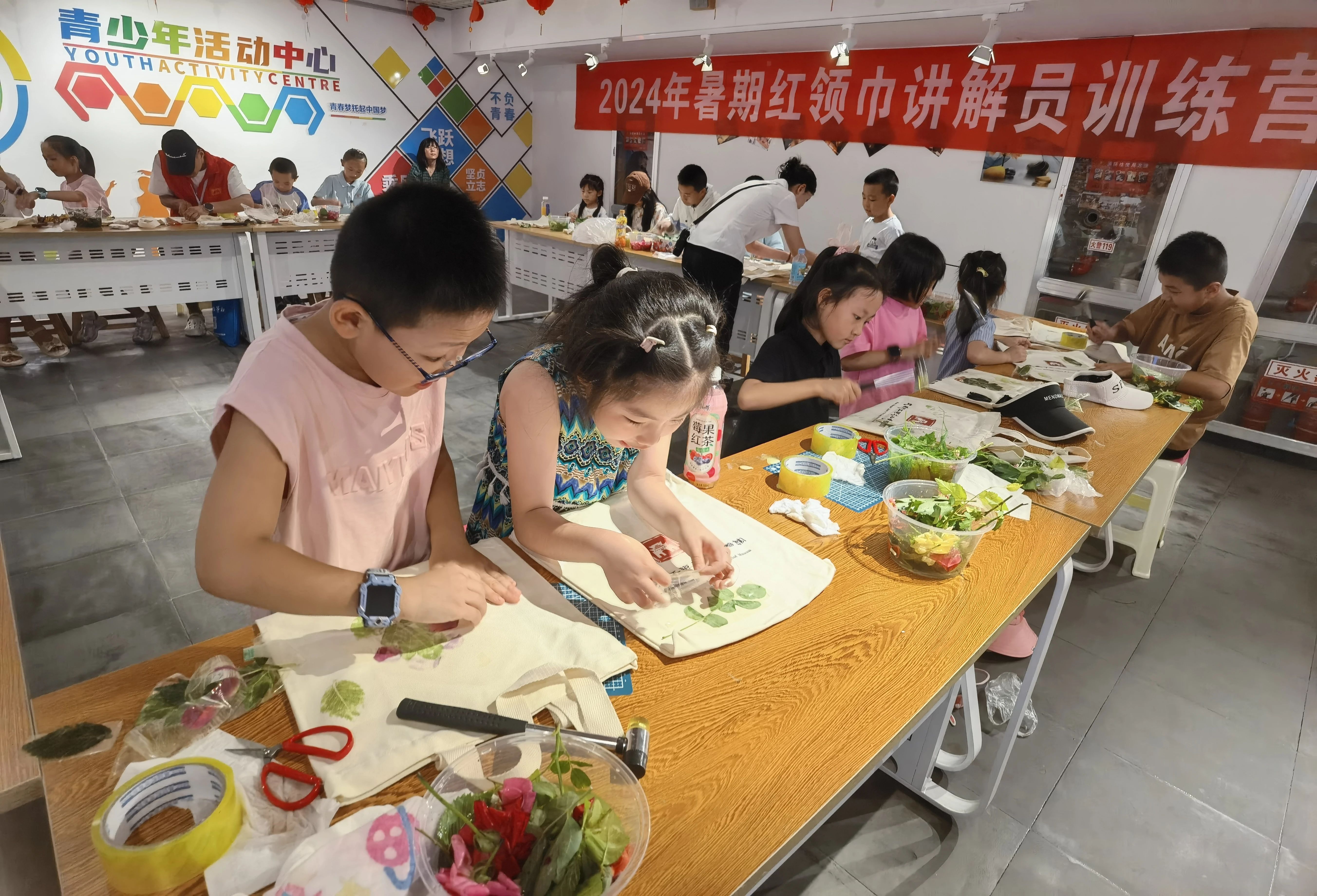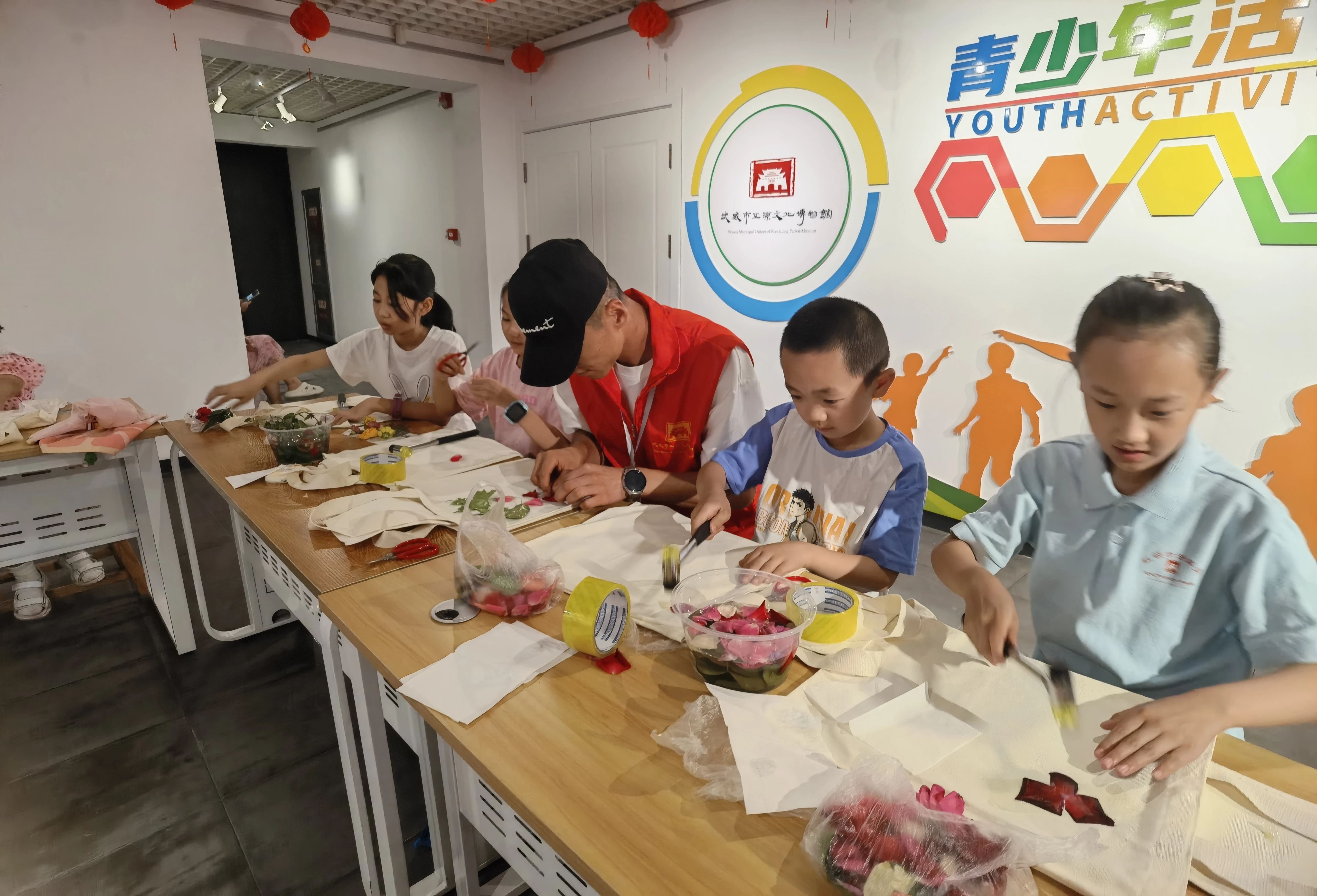 活动中,讲解员老师为大家介绍了七夕节的由来和文化内涵,传承和弘扬中华民族的优秀传统文化,同时,老师还声情并茂的为在场小朋友们讲解了植物拓印的历史,拓印制作的工具以及制作流程。通过现场指导,孩子们初步体验了拓印技艺。他们认真、精心挑选自己喜欢的树叶与花朵,放在准备好的扇子上进行拓染的设计、排列、布局,随后使用小锤子均匀反复地敲击。让植物的汁液和形状逐渐印染在布料上。每一次的敲击,都像是在与大自然进行一场亲密的对话,将植物的生命力和美丽永恒地定格在这一刻。