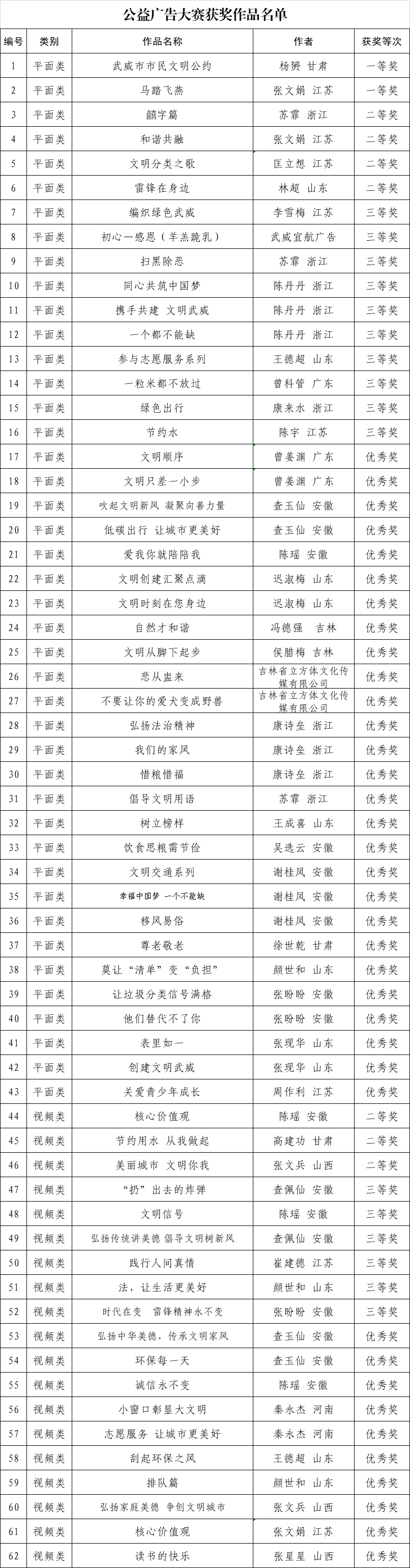 由武威市创城办、武威市文明办举办的武威市“创文明城 做文明人”主题公益广告设计大赛自开赛以来,受到社会各界高度关注,来自全国各地的设计者踊跃报名投稿,共收到各类作品1632幅(组)。经过前期初评、网络投票、专家评审、公示等环节,最终评定,平面类《武威市市民文明公约》等43幅(组)作品分获平面类一、二、三等及优秀奖,视频类《核心价值观》等19幅作品分获视频类二、三等及优秀奖,具体获奖等次详情见获奖作品名单。