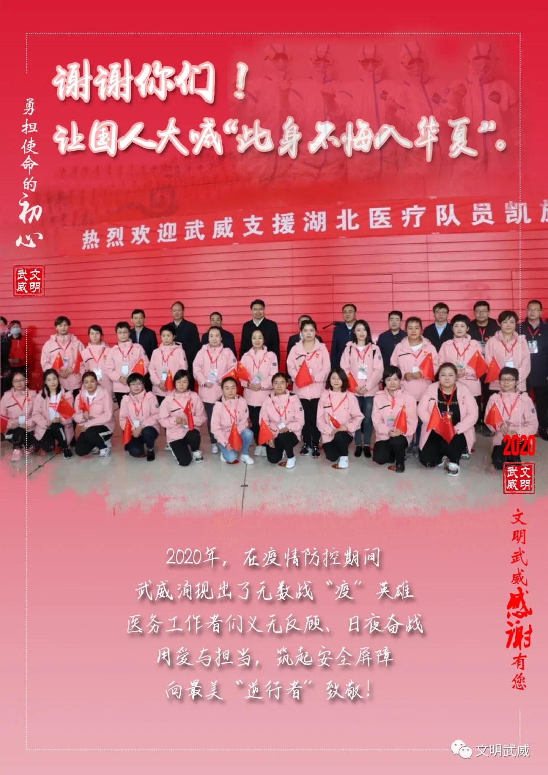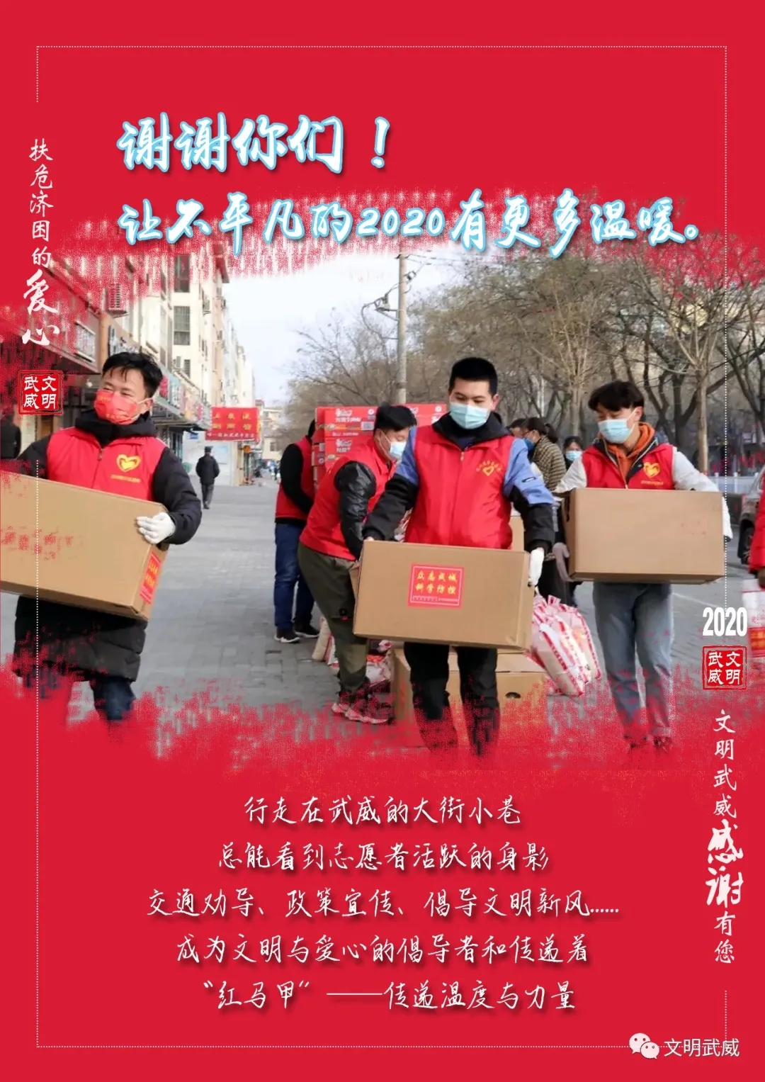 回望2020这不平凡的一年,时间流逝,影像定格。那一刻刻温暖的瞬间交织在一起,有收获也有遗憾,但希望与爱从未离开,总有一些人和事,化作希望和力量温暖着我们!在武威,有许多闪闪发光的身影,因为他们的努力才文明了这座城市。