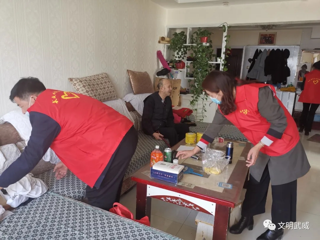 武威市新闻传媒集团志愿者帮助残疾老人打扫卫生。