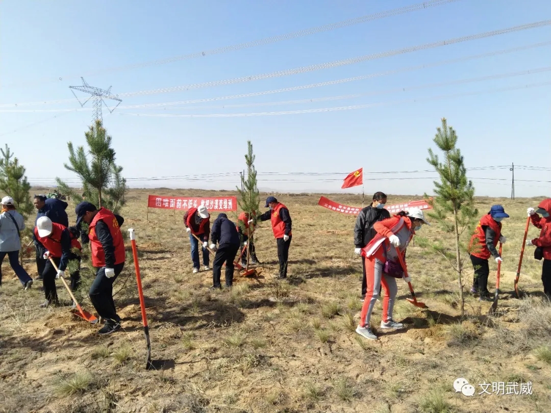 市政协志愿者在古浪县开展省市县政协“携手八步沙 共建政协林”义务植树活动。