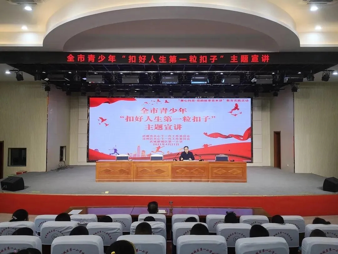 4月21日上午,武威市关工委“扣好人生第一粒扣子”主题宣讲活动,在武威新城区第一小学树人报告厅举行,举行爱党爱国、孝亲尊师等主题内容宣讲。