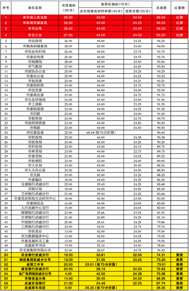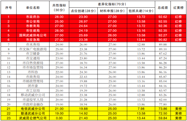 备注:一类单位总成绩为90分(含)以上的,二类、三类单位总成绩为95分(含)以上的红榜表扬。总成绩为75分(含)以下的黄榜警告。