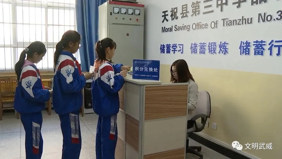 据了解,天祝县第三中学成立的“品德储蓄所”是储蓄良好品德行为习惯的“银行”,它参考银行运作方式,以“储蓄学习、储蓄锻炼、储蓄行为、储蓄诚信”等4大类50小项为内容,对同学们平时的学习表现、善行义举、文明行为等进行记录、监督、评价,并将获得的积分储存下来,等有需要的时候再到“品德储蓄所”兑换自己所需的学习用品,以此激励学生明理诚信、崇德向善、求学上进。