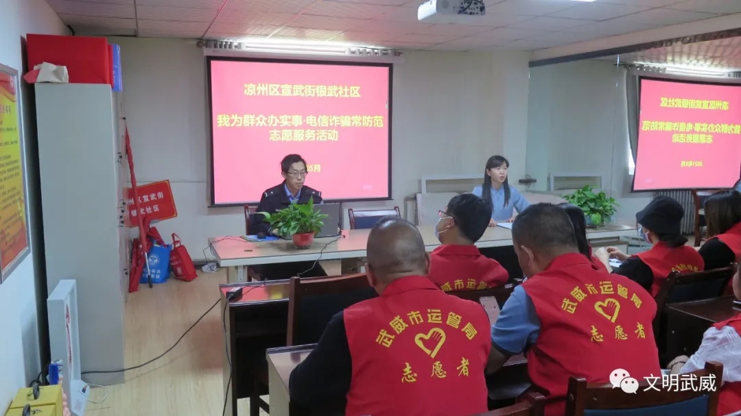 宣武街银武社区开展防范电信诈骗、禁毒宣传志愿服务活动。聆听防电信诈骗知识讲座、观看防诈骗短片、交流诈骗案例、了解电信诈骗的常用作案手段和防范措施。入户宣传普及防范知识,发放防范电信诈骗、禁毒宣传资料,提升居民对防骗知识知晓率,提醒居民提高防范诈骗和远离毒品。