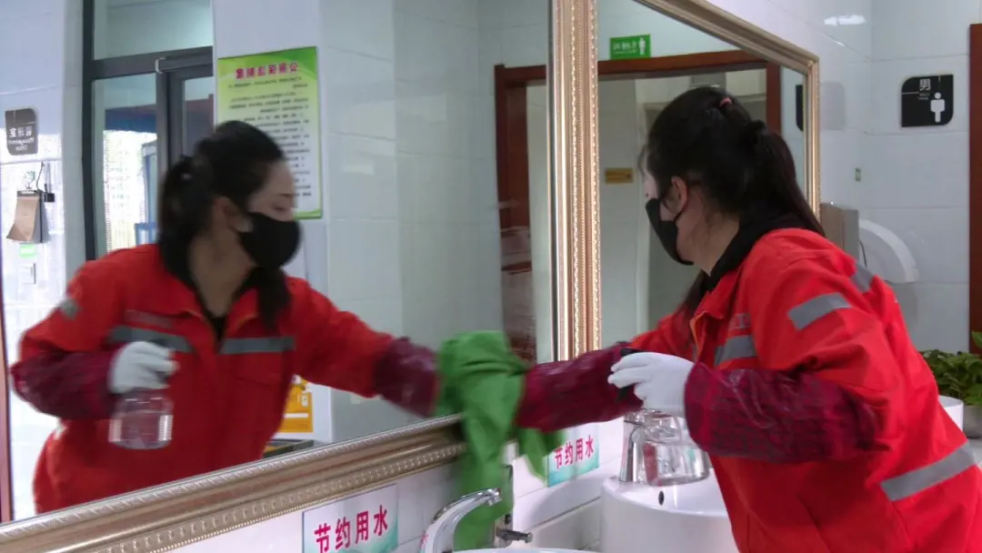 保洁员徐荣说:   我们上班首先开始检查台面、地面、蹲坑是否干净,点香、放纸、清洁地面。每半小时开始消毒,时刻保持公共卫生间干净、清洁,方便广大市民使用。