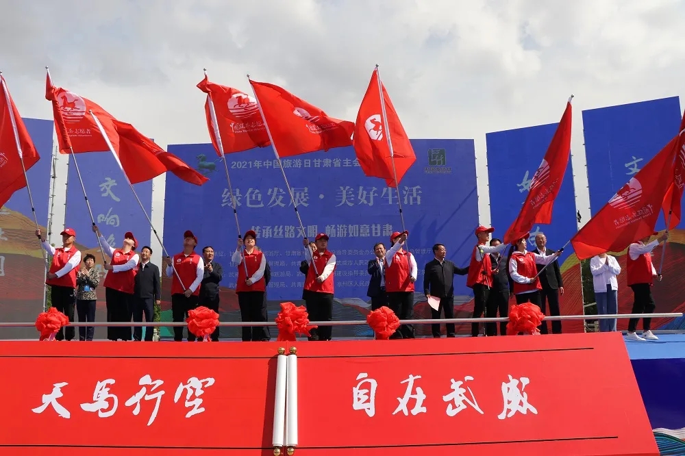 5月19日,以“绿色发展 美好生活——传承丝路文明 畅游如意甘肃”为主题,由省文化和旅游厅、省文明办、省应急管理厅、省市场监督管理局、共青团甘肃省委、武威市人民政府主办的“2021年中国旅游日甘肃省主会场宣传活动”武威雷台景区举行。旅游志愿者代表宣读《旅游志愿者文明旅游行动倡议书》;出席仪式的领导为甘肃旅游志愿者服务队授旗。