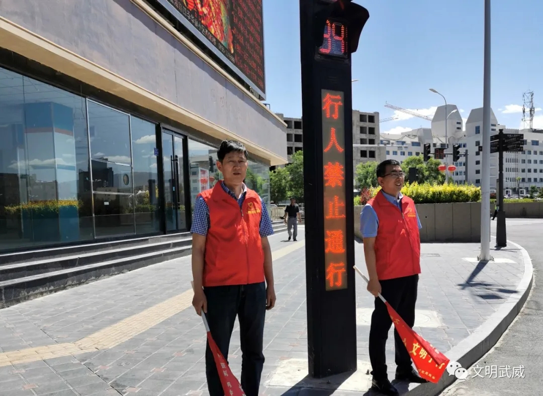 志愿者引导行人按红绿灯信号过马路,不闯红灯、不翻越护栏、 不走机动车道,劝导摩托车和电动车驾乘人员规范佩戴头盔,劝阻非机动车闯红灯、逆向行驶、不按规定车道行驶等不文明行为,强化市民文明交通意识,维护文明安全的交通环境,助推全国文明城市创建。