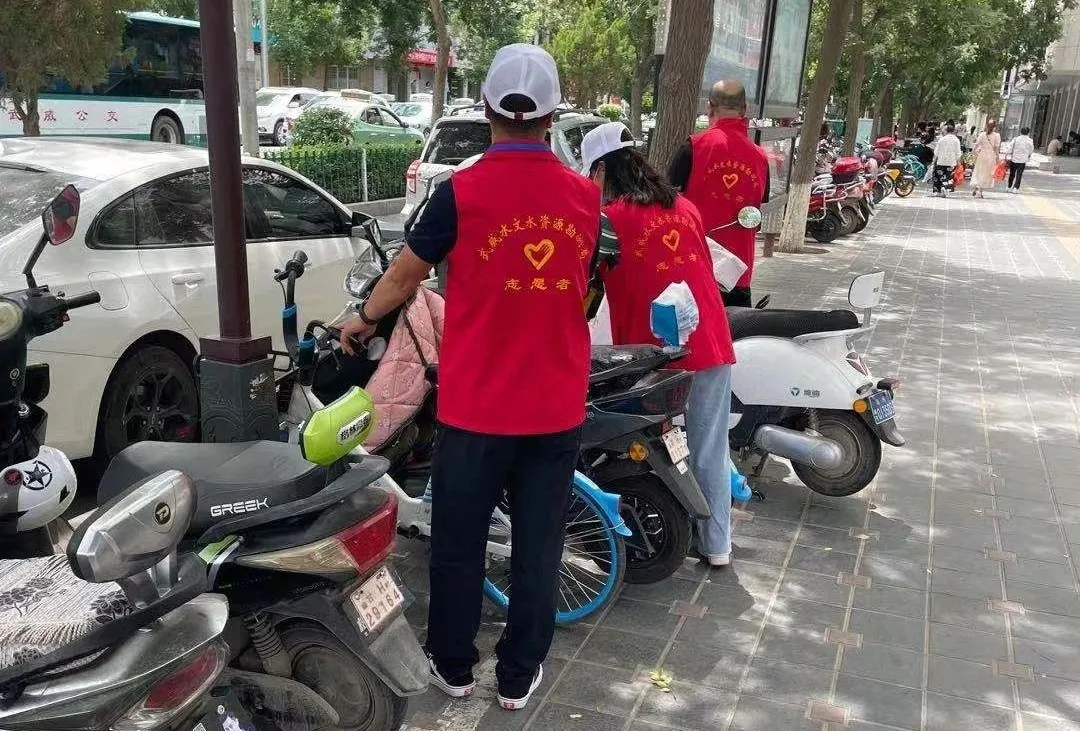 顶着炎炎烈日,为了给社区居民营造一个方便出行的良好的公共环境,志愿者把零星的单车集中摆放在停放区域,引导市民有序文明停放单车,助力建设美丽武威。