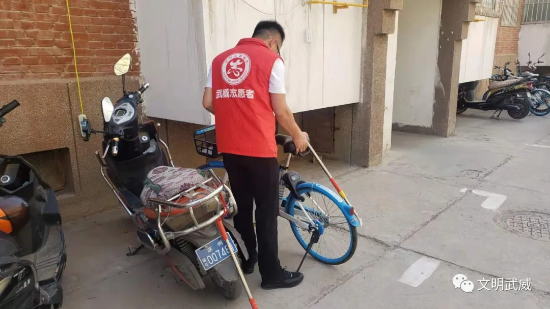 市政协志愿者在火车站大新社区开展自行车摆放志愿服务活动。