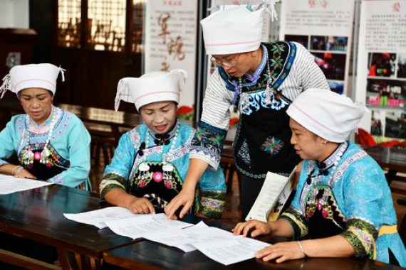 在贵州省龙里县新时代文明实践中心,龙里县“金嗓子”志愿服务队队长罗丽萍(右二)在指导志愿者们学唱新时代文明山歌(2020年7月3日摄)。