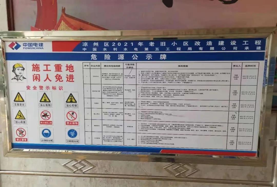 东关街复兴路老旧小区改造现场竖着几块公示牌,分别是施工单位、危险源告知、环境保护、安全生产、文明施工、建设(监管、设计、监理、承建)单位负责人、职务、联系电话等公示内容。记者在危险源公示牌看到,在吊篮作业、脚手架工程、卷扬机、施工用电、公共管道等作业内容上,对潜在的危险因素、可能导致的事故、规范的措施、责任人、监控人员等一一进行公示,不仅施工人员清清楚楚、明明白白,楼院的许多居民也在仔细阅读,更加强了自我防范意识。