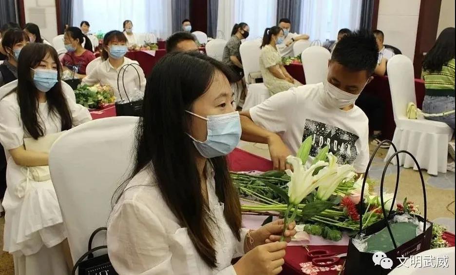 青年男女以花为礼以花会友通过插花活动传递节日祝福