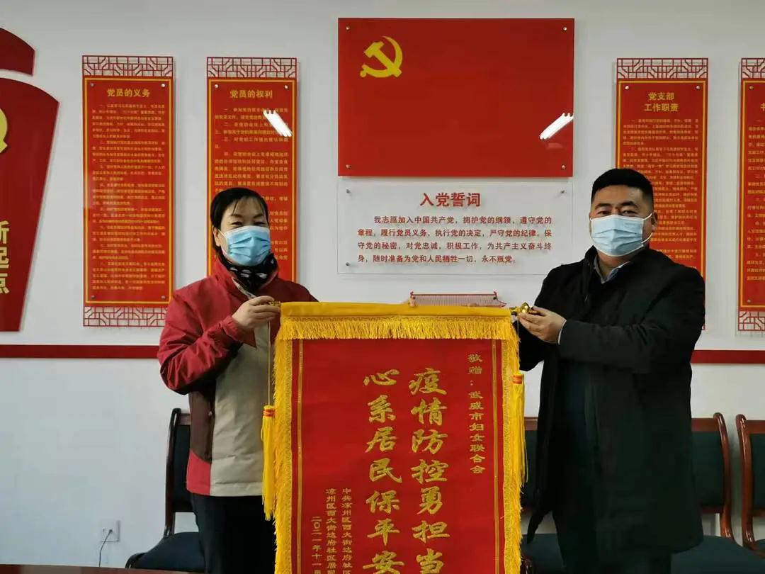衷心感谢市妇联对达府社区抗疫工作的大力支持,特送锦旗,略表谢意!11月10日,凉州区西大街达府社区负责同志向市妇联赠送锦旗,对市妇联干部下沉社区参与疫情防控,助力社区共同开展抗疫工作表达诚挚的谢意。