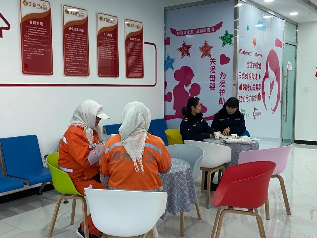 在一楼东南角的户外劳动者爱心驿站,配备了饮水设备、冷暖设备、微波炉、桌椅、应急药箱等,免费为户外劳动者提供休息、充电、喝水等服务;“母婴室”配备了婴儿床、尿布台、护理包等,为孕期、哺乳期、经期等特殊生理期女职工提供私密、干净、舒适、安全的休息服务。