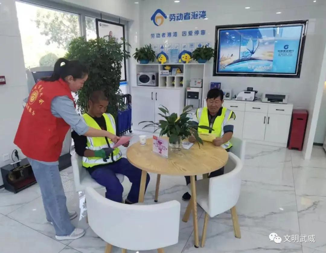 近日,市总工会、市文明办以我为群众办实事实践活动为抓手,以为户外劳动者提供方便为原则,以户外劳动者需求为导向,立足现有资源设立专区,科学规划、合理选址,将劳动者驿站打造为户外劳动者的温暖港湾。经各单位推荐申报,市总工会、市文明办对照规范化建设考核验收,中国银行宣武路支行站点、市政务服务中心站点、武威农商银行营业部站点等45个单位站点被命名为甘肃工会户外劳动者驿站