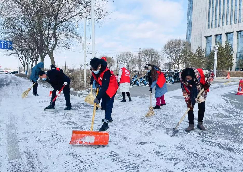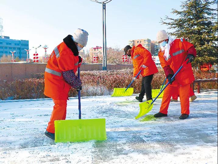 志愿者身穿红马甲,冒着严寒,或握帚扫雪、或挥锹铲雪,全力清除道路积雪和暗冰。铲雪、除冰、清运,各个岗位协同作战、配合默契,大家奋勇争先、不甘落后。扫雪过程中,志愿者温馨提醒过路行人“小心路滑”“慢点走,注意安全”,用热情融化着冰雪,用爱心温暖着人心。“昨天晚上雪虽然下得不大,但由于气温较低,广场和步行街的雪一点融化的迹象都没有。今天一大早,我们就开始铲雪除冰,争取尽快把路面清扫出来,为市民出行提供便利。”环卫工人许晓琴说。
