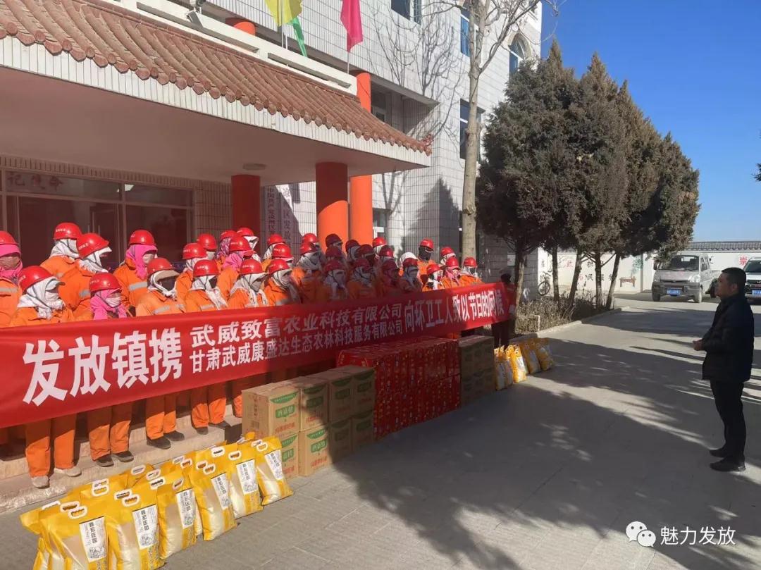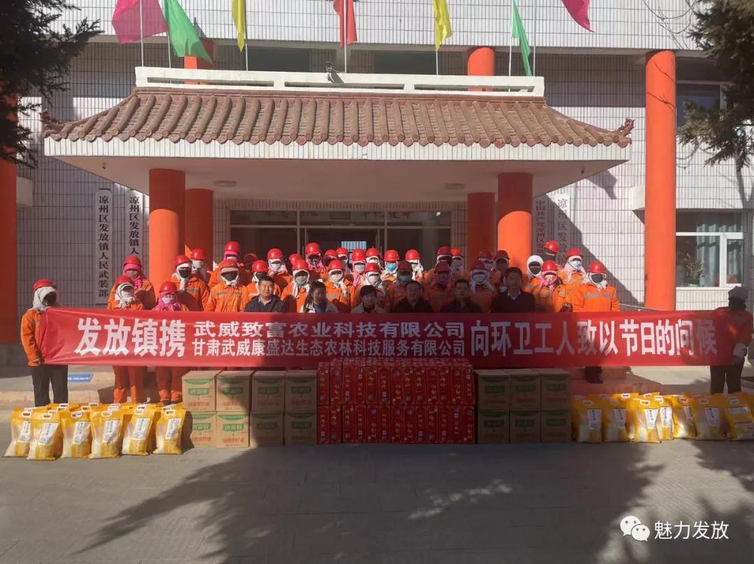 为表达对环卫工人感谢和崇敬之情,1月29日,发放镇携爱心企业武威致富农业科技有限公司、甘肃武威康盛达生态农林科技服务有限公司开展为一线环卫工人春节送温暖慰问活动,用实际行动表达了对环卫工人的尊敬与关心,为身边的环卫工人送来了冬日的温暖。