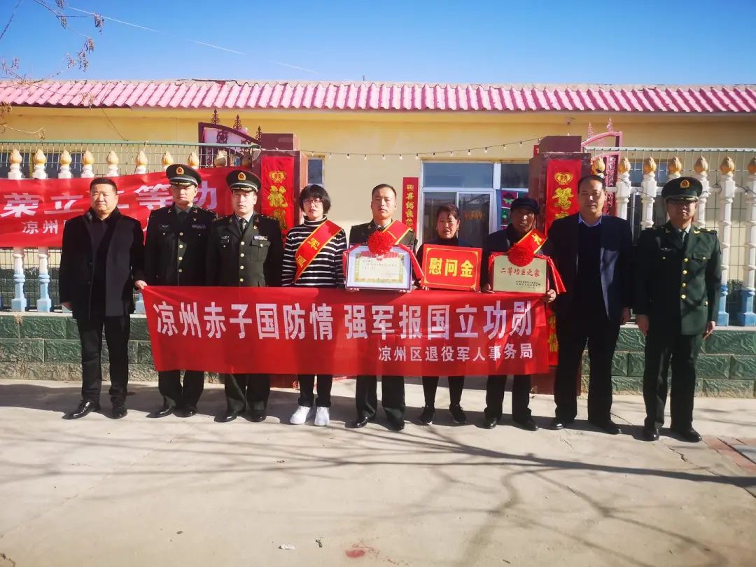 一线立军功,喜报送家乡。近日,凉州区人民武装部上校政委丁俊强、区退役军人事务局相关负责人及陆军某部政治处委派人员为凉州区黄羊镇荣昌村荣立二等功的现役军人家庭送上立功喜报。