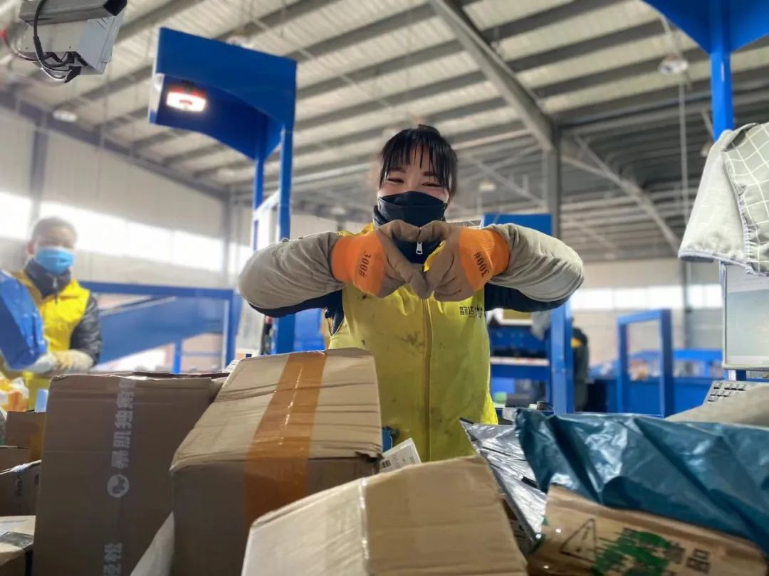 韵达快递员李玉梅在武威快递分拣中心分拣货物,从事这项工作一年多的她是快递员中的年轻一族,工作之余摆个“心形”调皮一下,辛苦并快乐着!