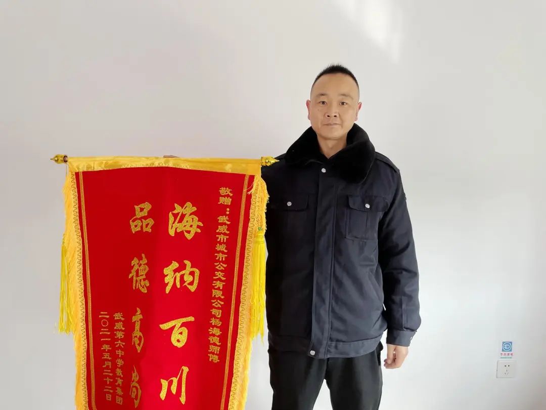 作为一名公交车司机,杨海德一直恪守司机的职业道德,诚实守信、热情服务,小到证件、外套,大到行李箱、笔记本电脑,无论价值多少,他都会及时联系失主归还。2021年5月的一个早晨,杨海德在行车中发现一个手提袋遗忘在车上,他打开一看手提袋内装有大学毕业证、学位证、教师资格证等各类重要证件和手机一部。从包内的资料杨海德了解到失主是武威第六中学的教师,于是他第一时间将手提袋送回六中的值班室,失主在值班室领回了自己的物品后,将一面“海纳百川 品德高尚”的锦旗和一封感谢信送到了武威城市公交有限公司,锦旗虽小,但字重千金,中华民族助人为乐的传统美德和社会主义核心价值观在杨海德的身上得以充分体现。