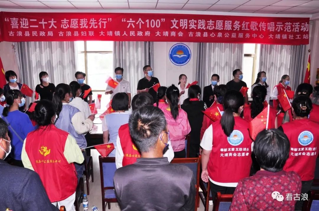 5月28日,古浪县妇联、县民政局、大靖镇、大靖商会、心泉公益服务中心、大靖镇社会工作服务站联合开展了喜迎二十大 志愿我先行”“六个100文明实践志愿服务红歌传唱示范活动。