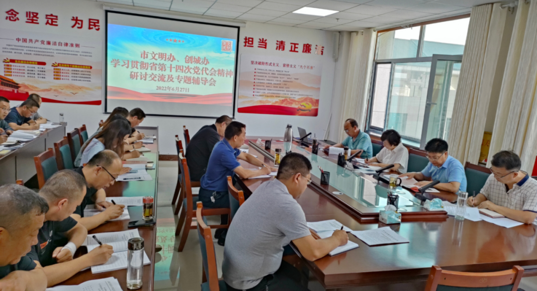 6月27日,市文明办召开学习贯彻省第十四次党代会精神研讨交流及专题辅导会议,专题学习了省第十四次党代会精神,进行了研讨交流,邀请市委宣讲团成员、市委讲师团副团长盛举文同志就学习贯彻省第十四次党代会精神作了专题辅导。