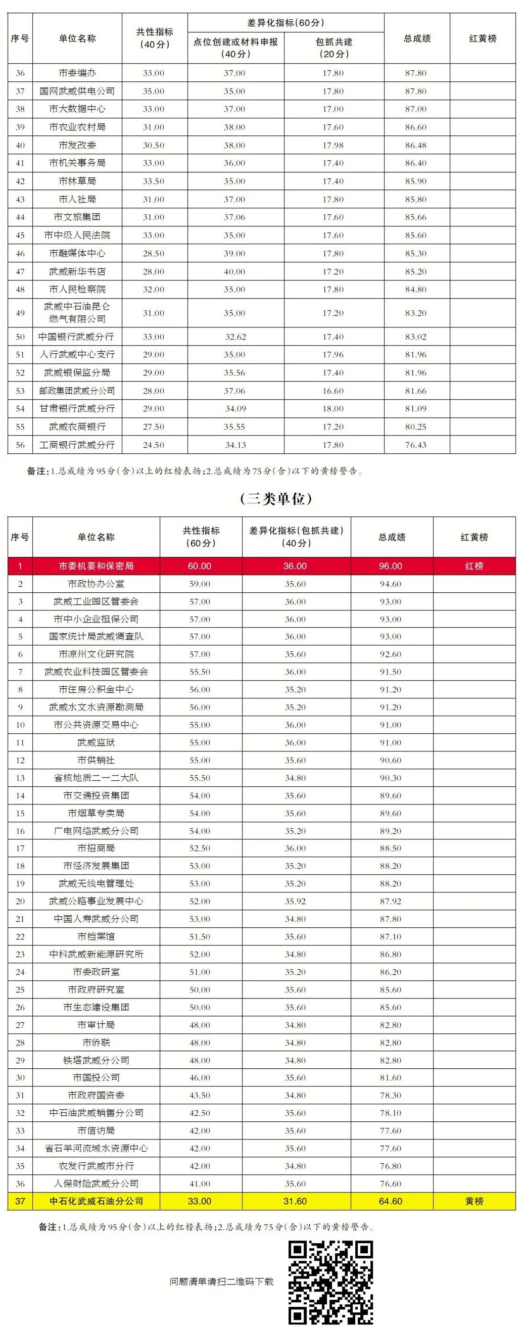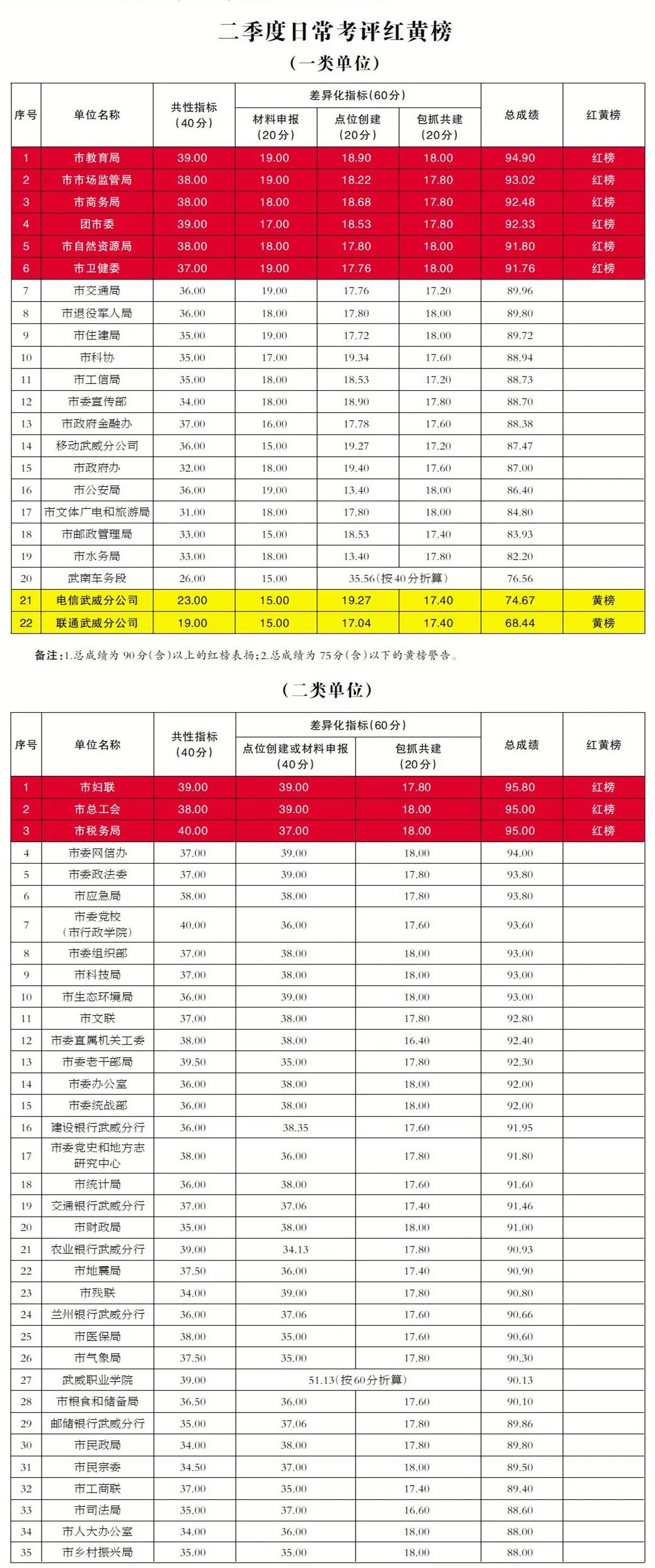 根据武威市创建第七届全国文明城市工作总体部署和《中共武威市委办公室 武威市人民政府办公室关于印发<武威市创建第七届全国文明城市工作考评考核办法(试行)>的通知》(武办发〔2021〕4号)要求,市创城办组织开展了2022年第二季度日常考评工作,考评工作严格按照《武威市创建第七届全国文明城市三年行动方案(2021一2023年)》《武威市创建第七届全国文明城市2022年工作实施方案》《武威市2022年创建全国文明城市“631”专项攻坚整治提升行动方案》目标任务和《全国文明城市(地级以上)测评体系操作手册(2022年版)》开展。现将考评结果公示如下: