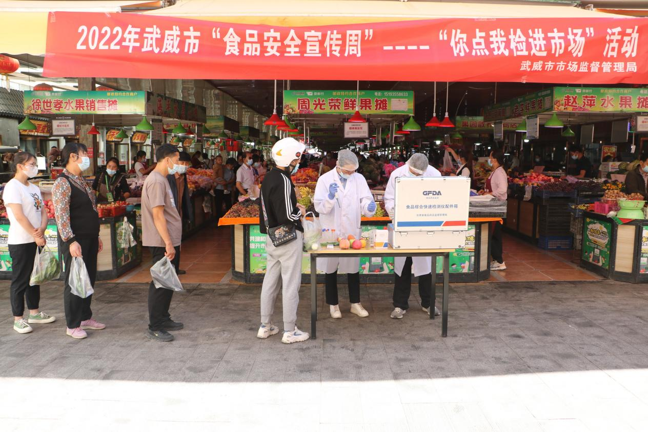 为积极发挥市场监管职能作用,聚焦群众关心的热点、难点问题。在食品安全宣传周活动期间,市、区市场监管部门坚持把食品安全宣传与检验检测紧密结合,在农贸市场、凉州区京华超市等单位开展“你送我检、你点我检”诚信宣传活动,让更多消费者直观了解食品安全快速检测全过程,“零距离”把控“舌尖上的安全”,切实为守护消费者“菜篮子”筑起了一道“防火墙”。