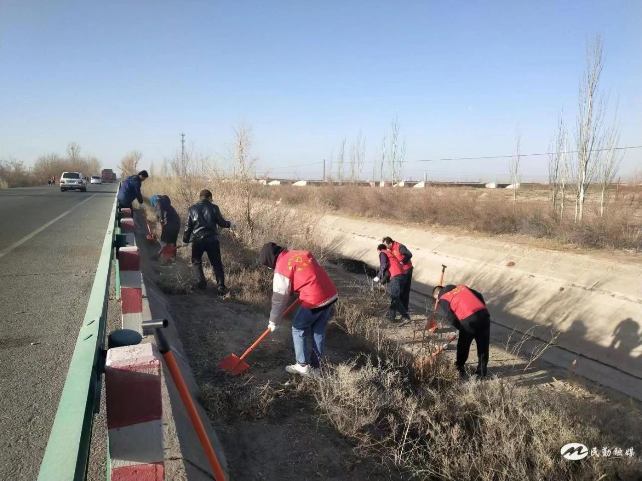 生态环保志愿者在公路沿线清除杂草垃圾