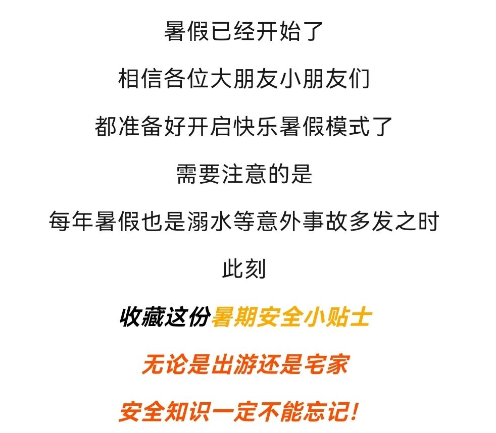假期虽快乐,撒欢儿的同时千万别忘了安全这件事!谨记这些安全提示,过一个平安、快乐、健康的暑假!
