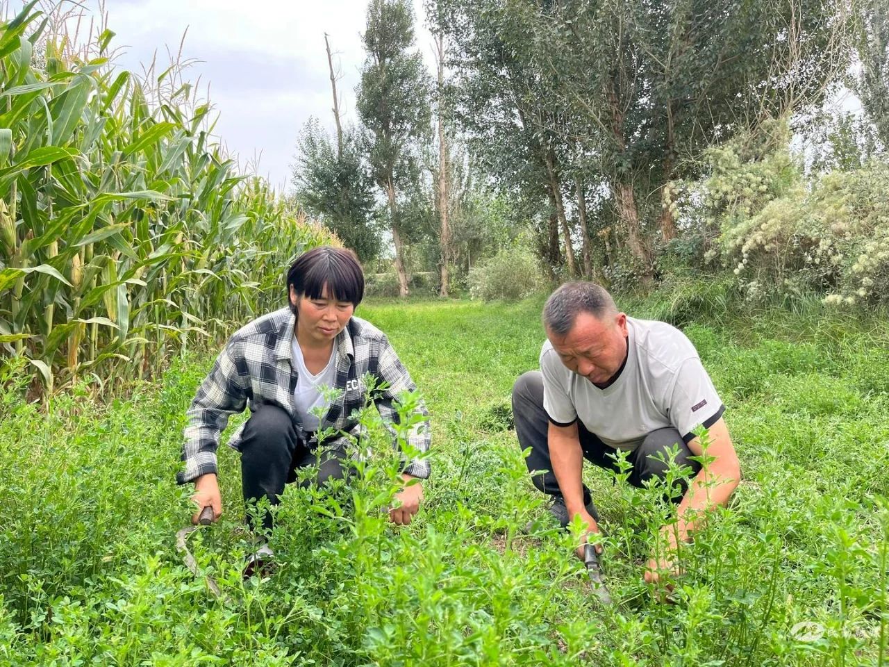裴爱民夫妻割苜蓿 胡蓉 摄