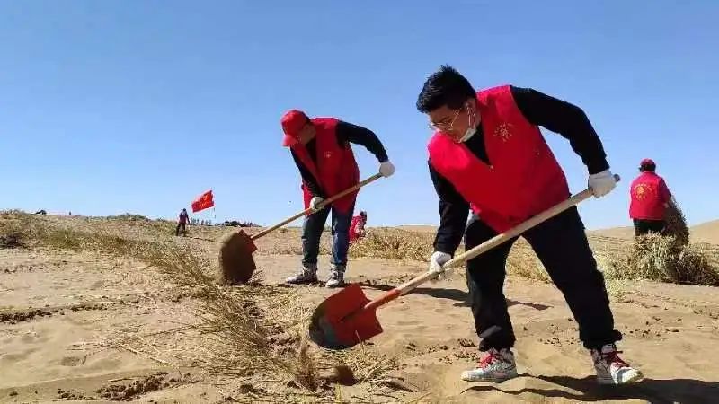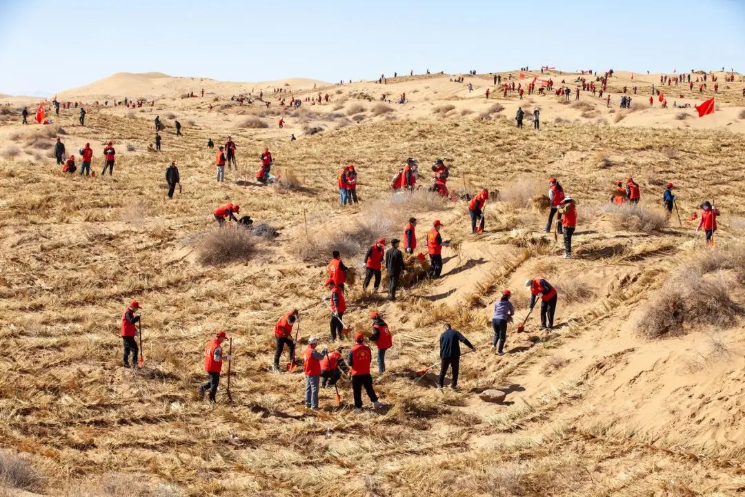 广大志愿者身着红马甲,不怕苦不怕累,开挖铺草、填沙整形……在一个个辛勤忙碌的身影下,网格状草方格沙障从无到有、渐次铺开,犹如一条条金色黄龙牢牢缚住了连绵沙丘,为春日沙漠增添了新的生机。