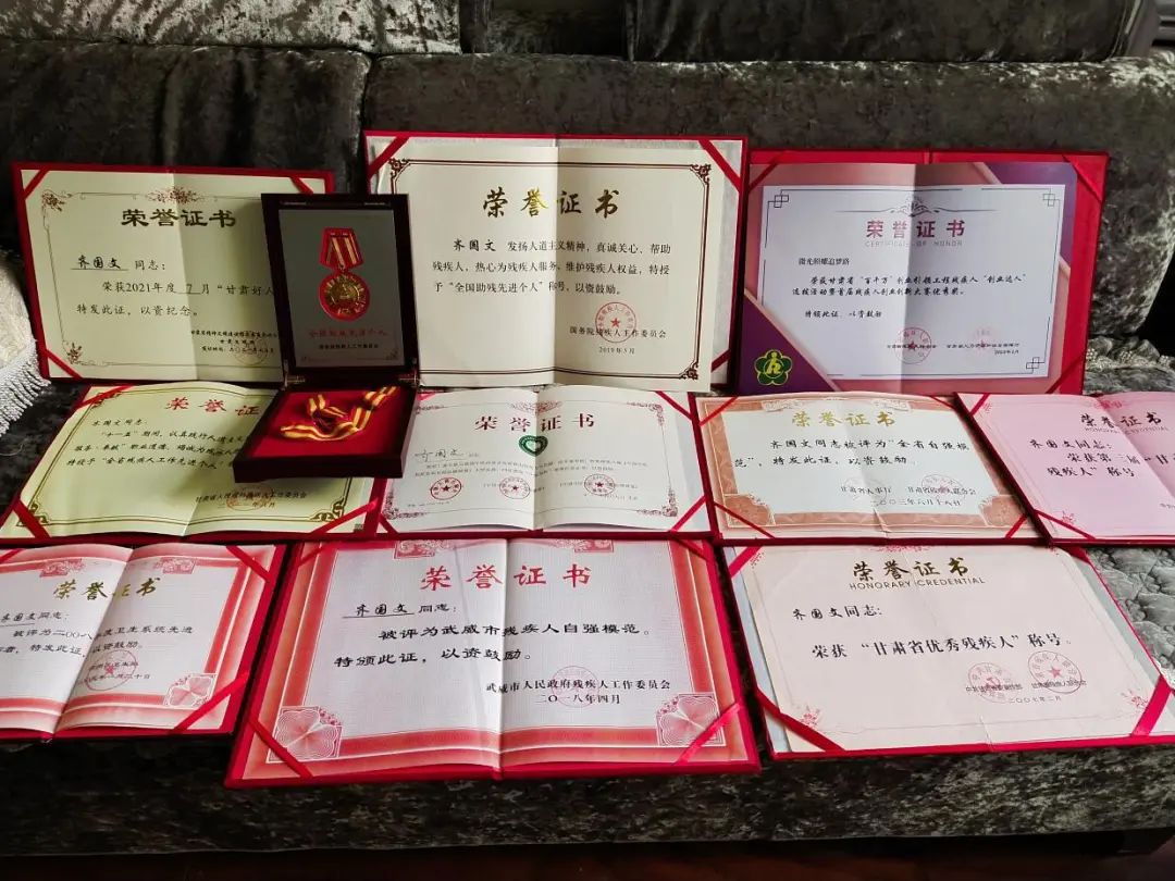 正是有着相同的身体遭遇,让齐国文对同样身体残疾的病患和家庭有着感同身受的情感,这也更加坚定了他从医济困的决心,几十年如一日在康复助残的路上持之以恒默默前行,以热忱服务书写着文明实践的温度,以微薄之力为“甘肃好人”品牌增光添彩,以爱心善举照亮残障人群的“康”庄大道。多年来,他先后获得“全省自强模范”“全省十大优秀残疾人”“甘肃省乡村名中医”“全省十大杰出残疾人”“全省残疾人康复工作标兵”“全国助残先进个人”等多项荣誉。2021年,齐国文荣登“甘肃好人榜”。