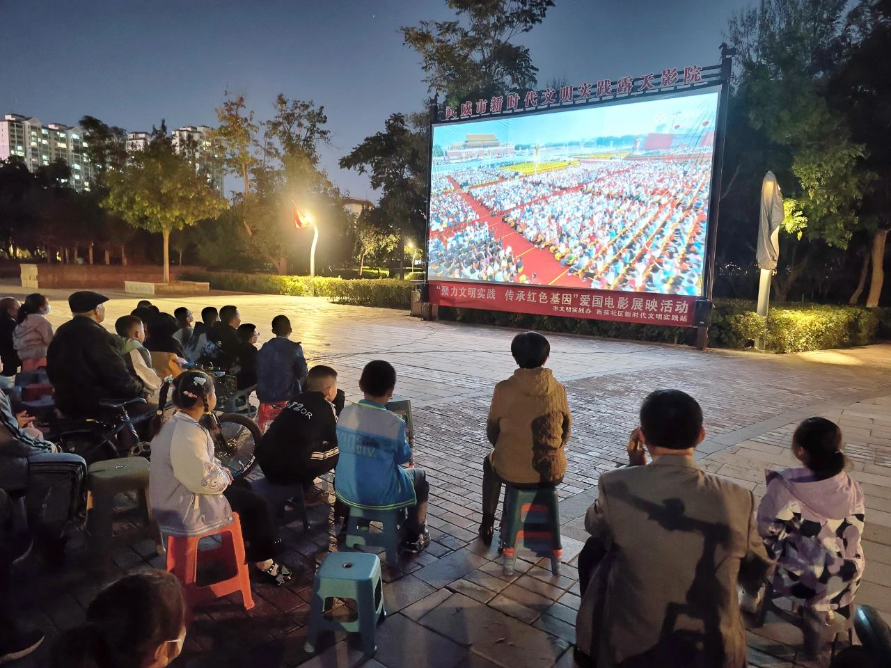 “看,这是你离北京天安门最近的一次,等你再大点,也带你去天安门”。10月1日,在武威市新时代文明实践露天影院内,一位家长指着银幕上正在播放的影片《此时此刻·2019大阅兵》,深情地对自己的孩子说到。当日,举国同庆新中国成立75周年华诞之际,由武威市文明实践办开展的“聚力文明实践 传承红色基因”爱国主义电影展映活动正在这里举行。