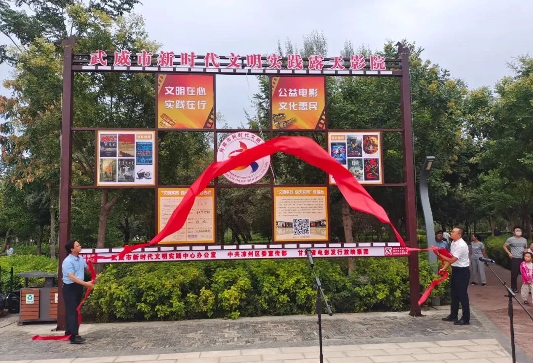 8月22日,随着红绸的缓缓揭开,武威市新时代文明实践露天影院在广大市民的热切期盼中正式揭牌,标志着全省首个新时代文明实践露天影院正式投入运营,为武威市文明实践阵地增添了浓墨重彩的一笔。揭牌仪式现场,周边居民纷至沓来,小朋友驻足凝神,等待电影上映。一些“70后”“80后”也回忆起了小时候跑十几里路追着放映队看露天电影的画面。“在那个没有手机和网络的年代,露天电影是最纯粹的快乐和满足,现在和大伙一起看,更具有烟火气”。