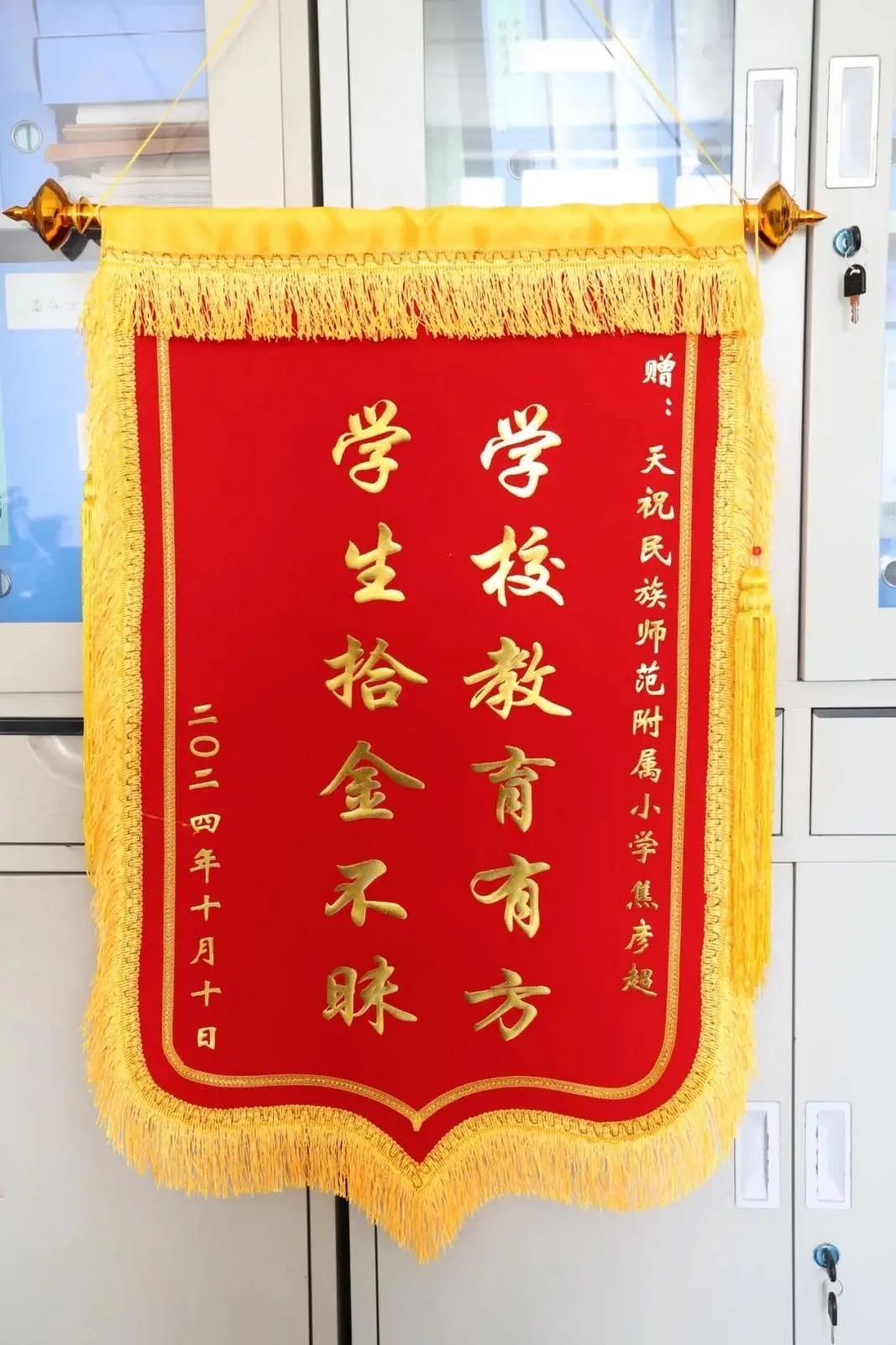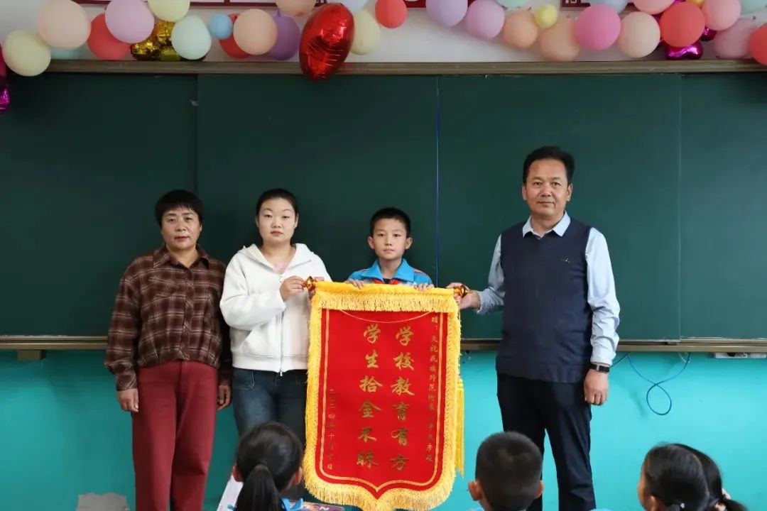 近日,天祝县市民张女士来到天师附小,将一面写有“学校教育有方 学生拾金不昧”的锦旗送到天师附小学生焦彦超手中,感谢他拾金不昧的高尚品质。
