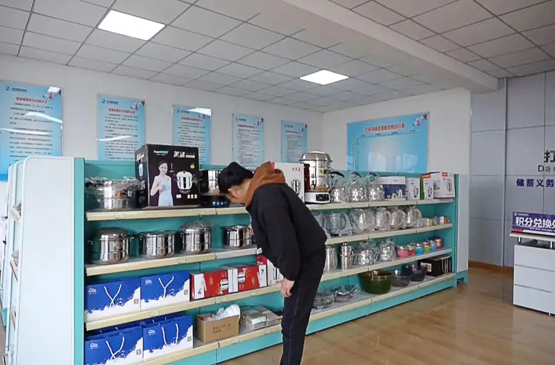 ▲村民在天祝县打柴沟镇道德储蓄所挑选积分兑换商品