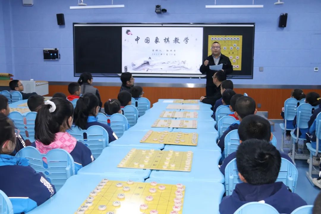 在象棋蒙目棋展示环节,王韬小棋士和我校工会主席翟友勇老师进行现场对决,同下一盘棋,他们凭着超强的记忆力和精湛的棋艺博得了现场师生的阵阵掌声。在互动环节,孙院长和小棋士走进学生中间,指导“三步杀”“两步杀”和“残局”的破解技巧,细致耐心地为他们一一答疑解惑。孩子们在一问一答中,茅塞顿开,棋艺的精粹和魅力悄然根植于他们的心中......