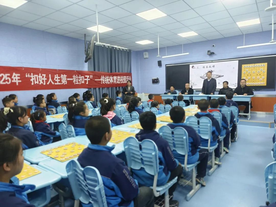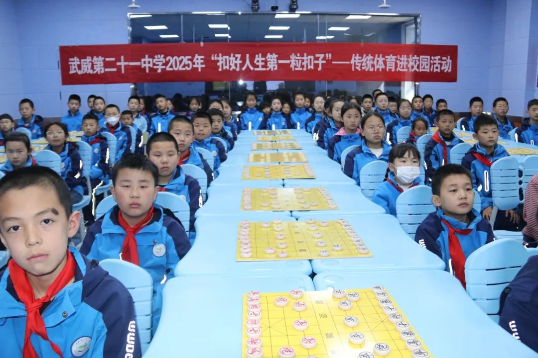 为进一步弘扬中华优秀传统文化,全面丰盈学校的体育课程体系,丰富校园文化生活,促进学生身心全面健康发展。2025年3月19日下午,武威第二十一中学开展了2025年“扣好人生第一粒扣子”—传统体育进校园活动。本次活动邀请甘肃省武威市红馨青少年体育俱乐部总教练、红馨棋院院长孙双云院长、甘肃省年龄最小的地方大师王韬小朋友走进校园,为师生们带来了一场趣味盎然的象棋启蒙课。