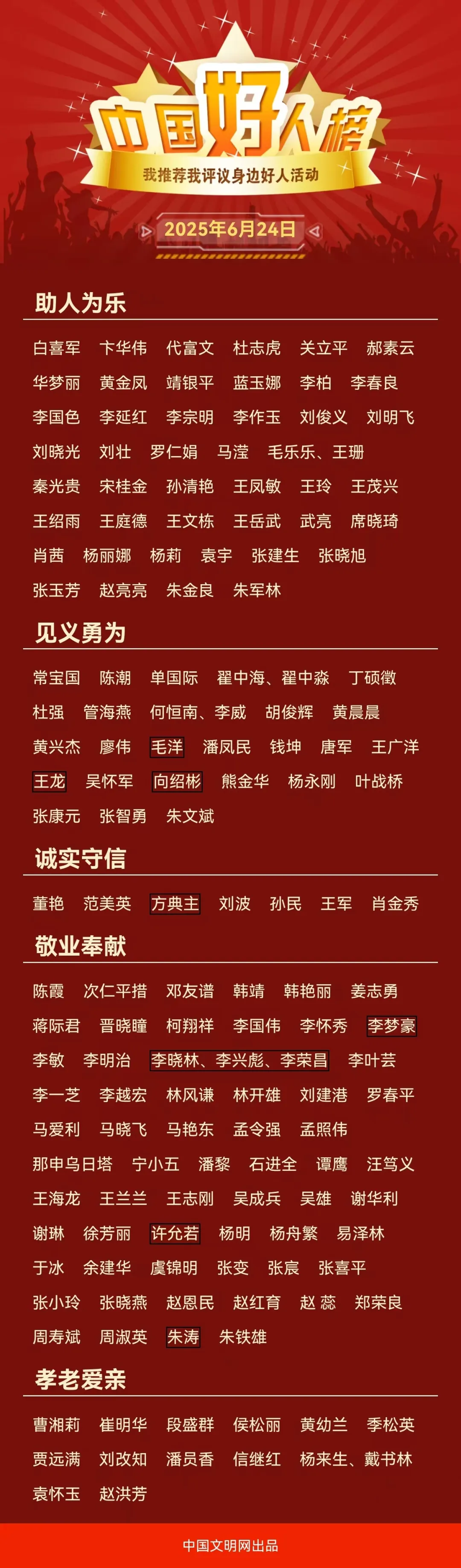 6月24日,2025年首次“中国好人榜”发布仪式暨全国道德模范与身边好人现场交流活动在河南省安阳市举办。经各地推荐、网友评议和专家评审等环节,共有152人(组)助人为乐、见义勇为、诚实守信、敬业奉献、孝老爱亲身边好人光荣上榜。武威市杜志虎上榜。